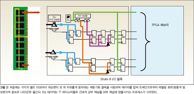 그리고 나서는 자유롭게 동작하는 재동기화 클럭(DQS와 동일한 주파수와 위상의)을 사용하여 데이터를 캡쳐 도메인으로부터 레벨링 회로(분홍색 및 오렌지색 링크로 나타낸)로 옮긴다.