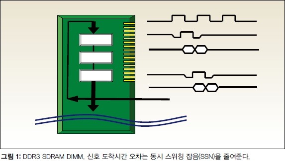 신호 도착시간 오차를 야기함으로써 동시 스위칭 잡음(SSN)을 줄여준다. 신호 도착시간 오차는 최대 0.8tCK에 이를 수있는데,