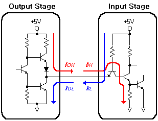 TTL에도 여러가지 종류가 있는데, 대표적인 표준형 TTL 소자의 출력단을 다른 표준형 TTL 소자의 입력단에 접속한 경우의 회로를 위의 그림에 보였다. 그림에서 보듯이 TTL은 출력이 H 상태일 때에는 출력단에서 전류가 흘러나가 다음의 입력단 회로로 흘러 들어 가고(이를 "source current"라고 부른다.), 출력이 L 상태일 때에는 다음의 입력단에서 전류가 흘러나와 출력단 회로로 흘러 들어 온다(이를 "sink current"라고 부른다.).