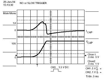 그림-11은 이 회로는 약 0.3amps로부터 최대 전류를 보여준다. 전압이 캐패시터를 통해 증가하면 거의 리니어(linear) 하다. 0.9 밀리초 상승시간 동안 합성된 최대 전류는 1.3amps 공식 I = c ? dv/dt를 통해 수학적으로 확인된다.