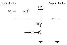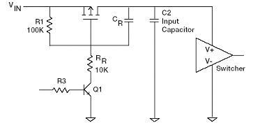 하나 더 회로 형상으로 드레인 보다는 전원단에 활용된 캐패시터를 탐구할 가치가 있다. 그림-13은 이 형상을 보여 준다. RC은 CR이 견딜 수 있도록 요구되고 그리고 스위치를 켰을 때 게이트 캐패시터은 방전된다. MOSFET은 VT(전압 드래스홀드)에서 스위치를 켜기 위해 동작한다. 따라서 어떤 전류가 CT에 위를 통과하기 전에 시간지연(time delay)이 있다.