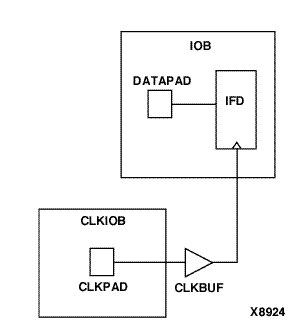 In the 2.1i release, the Xilinx timing tool analyzes OFFSET and FROM TO constraints that include IOB registers. The timing tool reports paths that start or end at IOB registers (including paths between components). This strategy requires the analysis of paths that internally have no length (that is, no components or connections), only a setup requirement, for pad-to-setup paths that originate at a pad and terminate at the input register within the same IOB. In the following example, the pad from the IOB pad to the input register IFD is analyzed and reported by the timing tool.