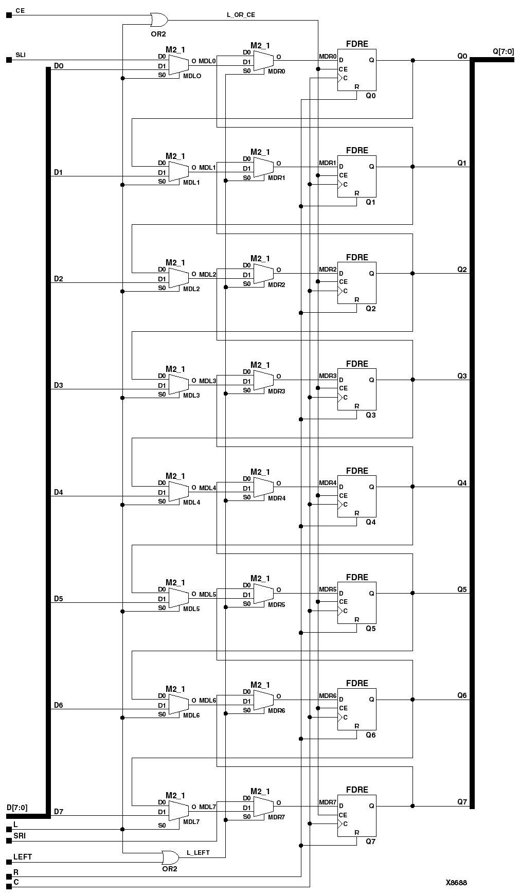 Figure 10.10 SR8RLED Implementation XC3000, XC4000E, XC4000X, XC5200, XC9000, Spartan, SpartanXL, Spartan2, Virtex