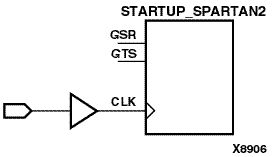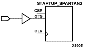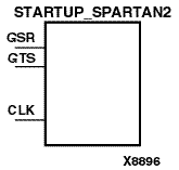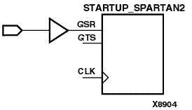 The STARTUP_SPARTAN2 primitive is used for Global Set/Reset, global 3-state control, and the user configuration clock. The Global Set/Reset (GSR) input, when High, sets or resets all flip-flops, all latches, and every block RAM (RAMB4) output register in the device, depending on the initialization state (S or R) of the component.