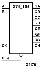 X74_164 is an 8-bit, serial input (A and B), parallel output (QH - QA) shift register with an active-Low asynchronous clear (CLR) input. The asynchronous CLR, when Low, overrides the clock input and sets the data outputs (QH - QA) Low. When CLR is High, the AND function of the two data inputs (A and B) is loaded into the first bit of the shift register during the Low-to-High clock (CK) transition and appears on the QA output. During subsequent Low-to-High clock transitions, with CLR High, the data is shifted to the next-highest bit position as new data is loaded into QA (A and B