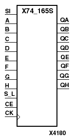 X74_165S is an 8-bit shift register with serial-input (SI), parallel- inputs (H - A), parallel-outputs (QH - QA), and two control inputs - clock enable (CE) and active-Low shift/load enable (S_L). When S_L is Low, data on the H - A inputs is loaded into the corresponding QH - QA bits of the register on the Low-to-High clock (CK) transition. When CE and S_L are High, data on the SI input is loaded into the first bit of the register during the Low-to-High clock transition. During subsequent Low-to-High clock transitions, with CE and S_L High, the data is shifted to the next-highest bit position (shift right) as new data is loaded into QA (SI
