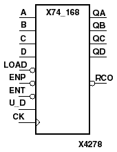 X74_168 is a 4-stage, 4-bit, synchronous, loadable, cascadable, bidirectional binary-coded-decimal (BCD) counter. The data on the D - A inputs is loaded into the counter when the active-Low load enable (LOAD) is Low during the Low-to-High clock (CK) transition. The LOAD input, when Low, has priority over parallel clock enable (ENP), trickle clock enable (ENT), and the bidirectional (U_D) control. The outputs (QD - QA) increment when U_D and LOAD are High and ENP and ENT are Low during the Low-to-High clock transition. The outputs decrement when LOAD is High and ENP, ENT, and U_D are Low during the Low-to-High clock transition. The counter ignores clock transitions when LOAD and either ENP or ENT are High.