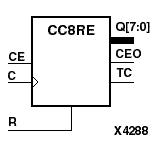 CC8RE and CC16RE are, respectively, 8- and 16-bit (stage), synchronous, resettable, cascadable binary counters. These counters are implemented using carry logic with relative location constraints to ensure efficient placement of logic. The synchronous reset (R) is the highest priority input. When R is High, all other inputs are ignored; the Q outputs, terminal count (TC), and clock enable out (CEO) go to logic level zero on the Low-to-High clock (C) transition. The Q outputs increment when the clock enable input (CE) is High during the Low-to-High clock transition. The counter ignores clock transitions when CE is Low. The TC output is High when all Q outputs and CE are High.