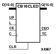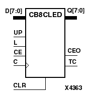 CB2CLED, CB4CLED, CB8CLED, and CB16CLED are, respectively, 2-, 4-, 8- and 16-bit (stage), synchronously loadable, asynchronously clearable, cascadable, bidirectional binary counters. The asynchronous clear (CLR) is the highest priority input. When CLR is High, all other inputs are ignored; the Q outputs, terminal count (TC), and clock enable out (CEO) go to logic level zero, independent of clock transitions. The data on the D inputs is loaded into the counter when the load enable input (L) is High during the Low-to-High clock (C) transition, independent of the state of clock enable (CE). The Q outputs decrement when CE is High and UP is Low during the Low-to-High clock transition. The Q outputs increment when CE and UP are High. The counter ignores clock transitions when CE is Low.