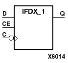 The IFDX_1 D-type flip-flop is contained in an input/output block (IOB). The input (D) of the flip-flop is connected to an IPAD or an IOPAD. The D input also provides data input for the flip-flop, which synchronizes data entering the chip. The data on input D is loaded into the flip-flop during the High-to-Low clock (C) transition and appears at the output (Q). The clock input can be driven by internal logic or through another external pin. When the CE pin is Low, the output (Q) does not change.