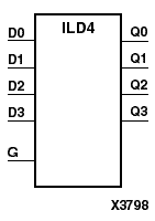 ILD, ILD4, ILD8, and ILD16 are single or multiple transparent data latches, which can be used to hold transient data entering a chip. The ILD latch is contained in an input/output block (IOB), except for XC5200 and XC9000. The latch input (D) is connected to an IPAD or an IOPAD (without using an IBUF). When the gate input (G) is High, data on the inputs (D) appears on the outputs (Q). Data on the D inputs during the High-to-Low G transition is stored in the latch.