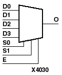 M4_1E is an 4-to-1 multiplexer with enable. When the enable input (E) is High, the M4_1E multiplexer chooses one data bit from four sources (D3, D2, D1, or D0) under the control of the select inputs (S1 - S0). The output (O) reflects the state of the selected input as shown in the truth table. When E is Low, the output is Low.