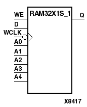 RAM32X1S_1 is a 32-word by 1-bit static random access memory with synchronous write capability. When the write enable is Low, transitions on the write clock (WCLK) are ignored and data stored in the RAM is not affected. When WE is High, any negative transition on WCLK loads the data on the data input (D) into the word selected by the 5-bit address (A4 - A0). For predictable performance, address and data inputs must be stable before a High-to-Low WCLK transition. This RAM block assumes an active-High WCLK. However, WCLK can be active-High or active-Low. Any inverter placed on the WCLK input net is absorbed into the block.