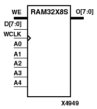 RAM32X8S is a 32-word by 8-bit static random access memory with synchronous write capability. When the write enable (WE) is Low, transitions on the write clock (WCLK) are ignored and data stored in the RAM is not affected. When WE is High, any positive transition on WCLK loads the data on the data inputs (D7 - D0) into the word selected by the 5-bit address (A4 - A0). For predictable performance, address and data inputs must be stable before a Low-to-High WCLK transition. This RAM block assumes an active-High WCLK. However, WCLK can be active-High or active-Low. Any inverter placed on the WCLK input net is absorbed into the block.