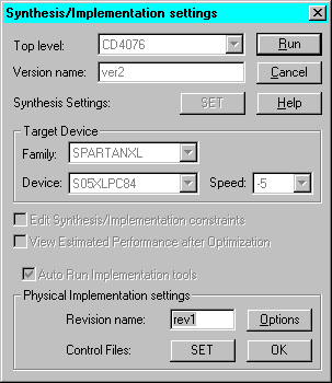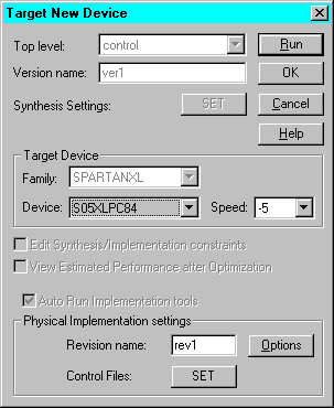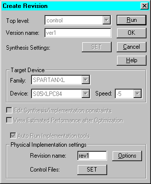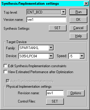 Create Version. This accesses the Synthesis/Implementation settings dialog box (see theSynthesis/Implementation Dialog Box figure) where you can select the Top Level design, name the version, select a target device.