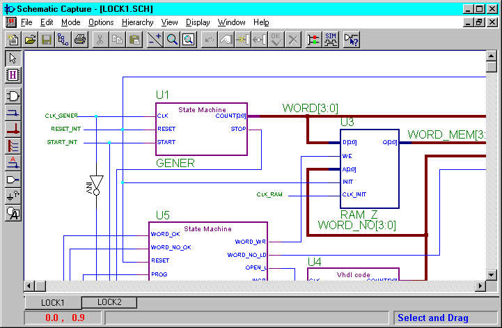 Note the LOCK1 and LOCK2 tabs in the lower left corner of the figure. Clicking on the LOCK2 tab navigates to the LOCK2 schematic sheet. For every new schematic sheet added to the design, a new tab displays.