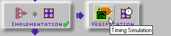 - Open the Timing Simulator by clicking the Timing Simulation icon in the Verification box on the Project Managers's Flow tab. The implementation timing netlist with worst-case delays will be loaded into the simulator.