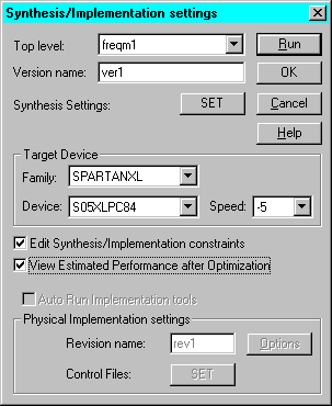 - The Synthesis/Implementation dialog box is displayed if this is the first version and revision of a project. (By default on subsequent runs, the same settings are used and the given version is overwritten. To create a new version, or to change settings, select Project
