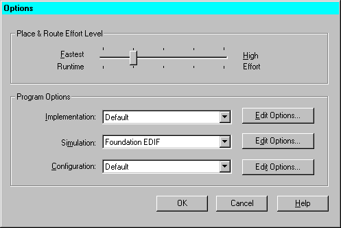 - Click Options on the Synthesis/Implementation dialog box to set the Place and Route Effort level and edit implementation, simulation, or configuration options, if desired.