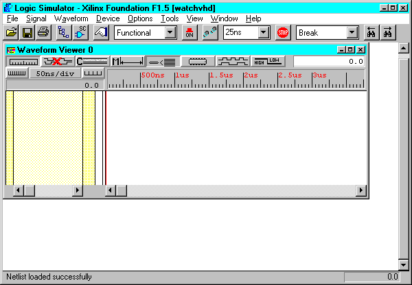 - The design is automatically loaded into the simulator. The Waveform Viewer window displays inside of the Logic Simulator window.