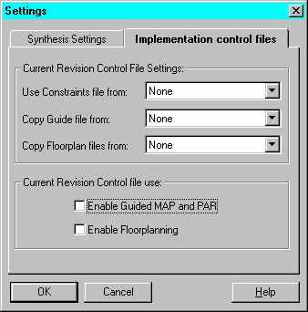 - Click Set to access the Implementation control files dialog box. Identify any guide file, constraints file, or Floorplan file to use for this implementation.