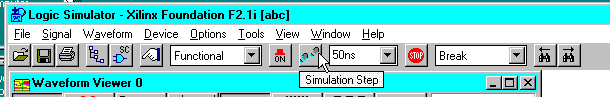 - After the stimulus has been applied to all inputs, click the Simulator Step icon on the Logic Simulator toolbar to perform a simulation step. The length of the step can be changed in the Simulation Step Value box to the right of the Simulation Step box. (If the Simulator window is not open, select View
