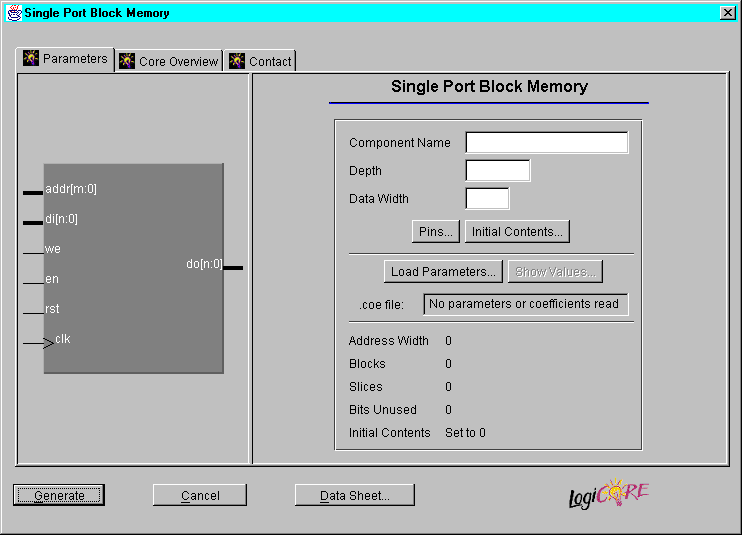 You select a CORE by clicking on its name in the Contents of section of the CORE Generator window. This opens a new window where you can customize the CORE for your use, view its data sheet, and get other information concerng the CORE. The items that can be customized for a particular CORE depend on what the CORE is. The following figure shows that window that opens when you select a single port block memory core for a Virtex project.