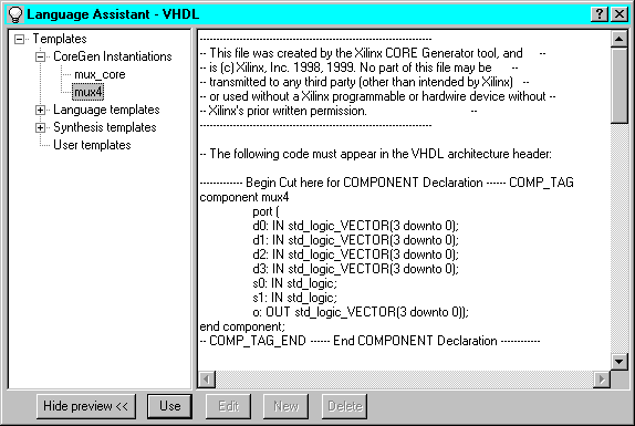 Language Assistant) includes CORE Generator Modules. You can get assistance with instantiating them in VHDL or Verilog.